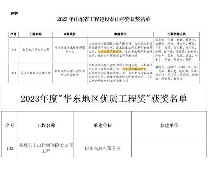 由公司承建的菏泽市郓巨河治理工程(巨野县段)与庄里水库工程均被授予了“泰山杯”奖。该奖项是山东省对工程建设中技术革新、质量管理及整体执行力等综合素质最高层次的肯定。郓巨河治理工程和庄里水库两个项目对于提升当地防洪能力、改善生态环境以及保障区域供水安全起到了关键作用,并将为当地经济社会发展做出长远贡献。