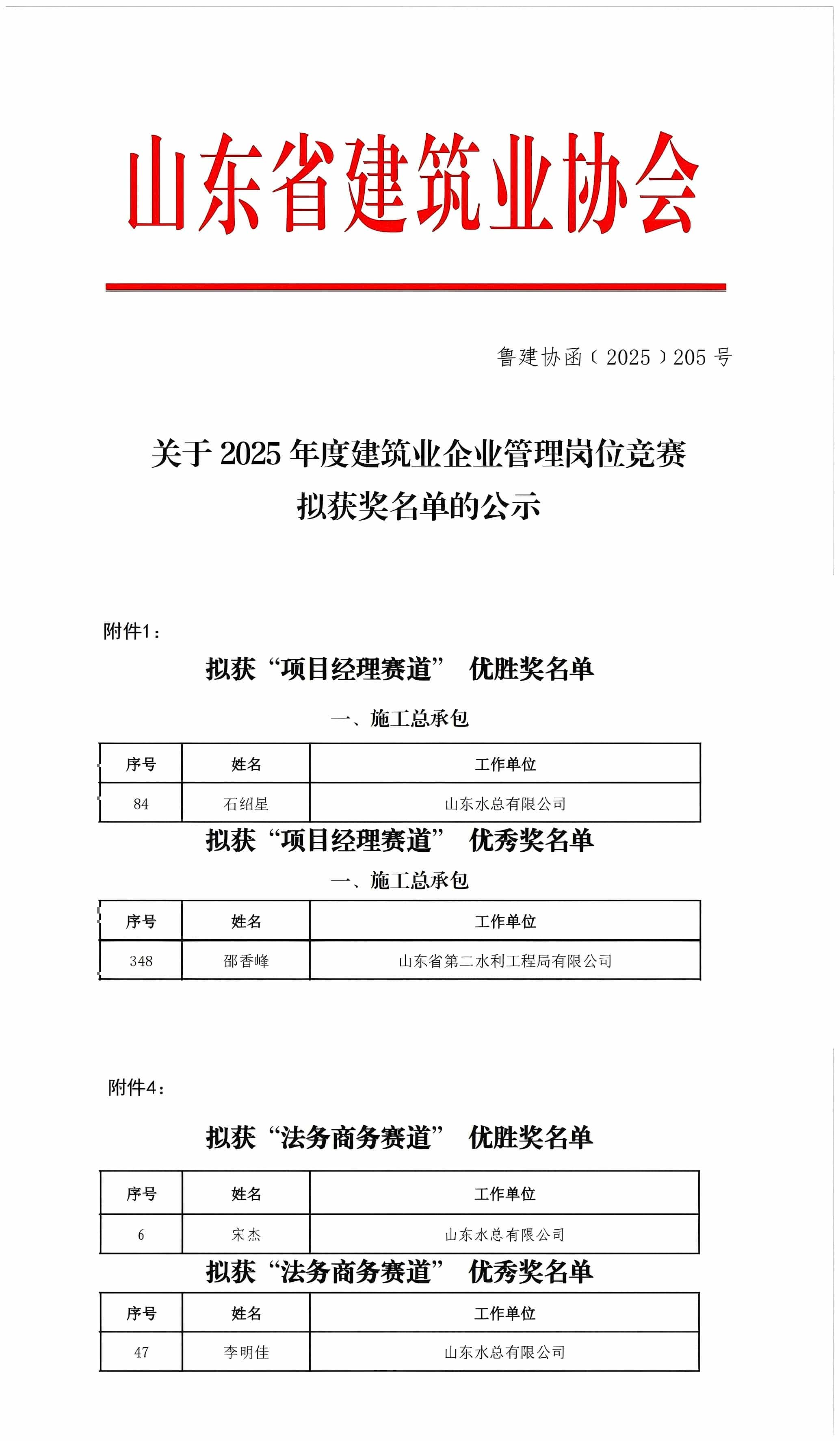 近日,由山东省建筑业协会发起的2025年度建筑业企业管理岗位竞赛圆满落幕,公司选送的参赛人员凭借扎实的专业素养、精湛的管理能力脱颖而出,在“项目经理赛道”中,第三分公司石绍星获优胜奖,二局有限公司邵香峰获优秀奖;在“法务商务赛道”中,企业管理部宋杰获优胜奖,第三分公司李明佳获优秀奖。以上荣誉的获得充分彰显了公司建筑行业管理岗位人才的专业素养与创新活力。